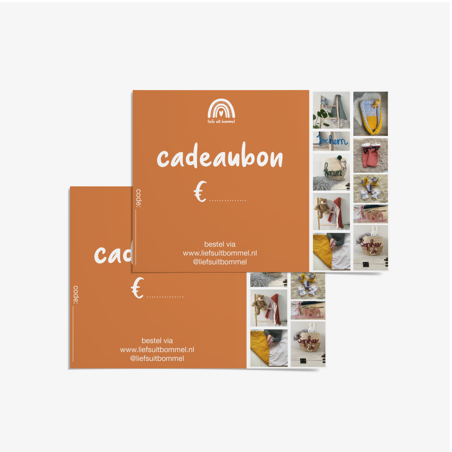 We sturen de bon op in een leuke cadeauverpakking. De bestelling kan vervolgens met de unieke code en uitleg gedaan worden bij liefsuitbommel