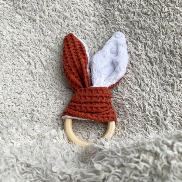 Een leuke bijtring die goed past bij een babyuitzet in de kleur terra met minky fleece. Ook erg leuk om cadeau te doen als kraamcadeau.